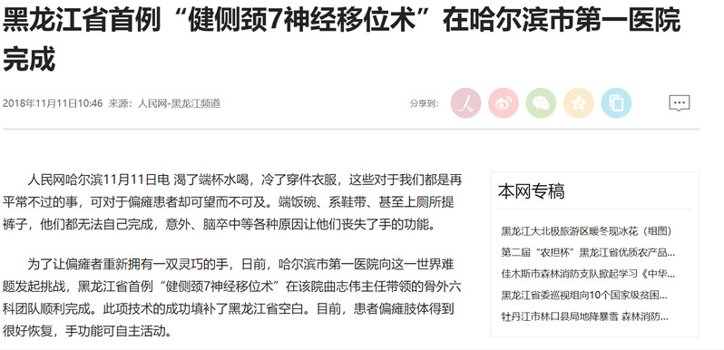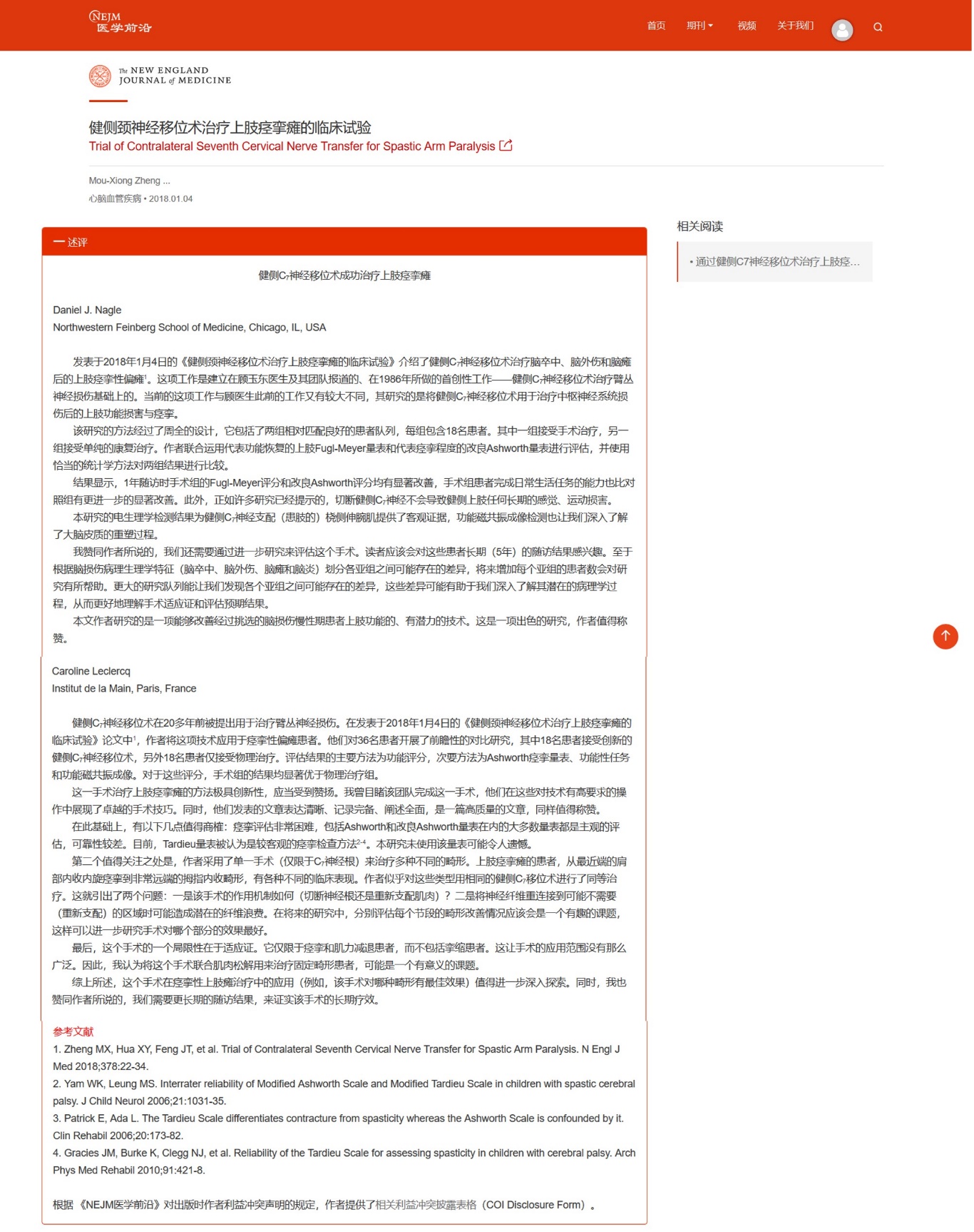 论文“Trial of Contralateral Seventh Cervical Nerve Transfer for Spastic Arm Paralysis”,2018年1月4日发表在《新英格兰医学杂志》(NEJM)(IF=79.26),团队成员包括郑谋雄(第一作者)、华续赟(共同一作)、徐建光。该研究论文是针对一侧中枢神经损伤后上肢痉挛性偏瘫,将健侧上肢的颈7神经移位至患侧上肢,将患肢与同侧(健侧)大脑半球连接,从而开发健侧大脑半球的潜能、使其控制瘫痪上肢的临床研究成果。2019年1月,在NEJM官网公布的2018年NEJM最受瞩目的12篇论著(NEJM Notable Articles of 2018)中,该研究排名第一。此研究为目前治疗困难的中枢性偏瘫提出全新的治疗策略,对未来更深入开展周围神经与脑重塑研究有重要意义。