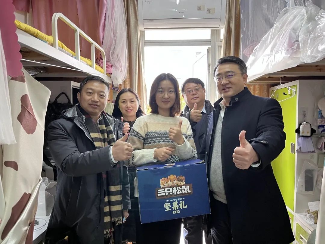 公司党总支书记向延卫、经理单春雷、副书记毕亚男、副经理许东升、辅导员季伟一同走进员工宿舍,倾听员工心声,了解员工需求,为留校员工尤其是家庭经济困难员工送上公司准备春节慰问品。公司关心每一位留校员工的生活保障和假期安排,鼓励员工做好疫情防控,努力学习,勤加锻炼,充实寒假。