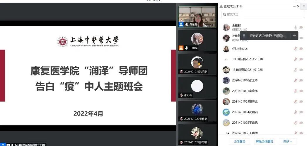 接着,胡馨婷同学与王欢同学分享了自己在封校隔离期间的志愿者经历,切身体会到了“大白”们的辛苦;陈宁远同学分享了自己的妈妈作为一线采样医务工作者的工作现状,线上的同学们无不为之动容;吴何必学长分享了自己在方舱中的志愿经历,他用自己的实际行动,向所有人展示了他身为一名上中医学子、一名中国共产党党员肩上的责任和担当。