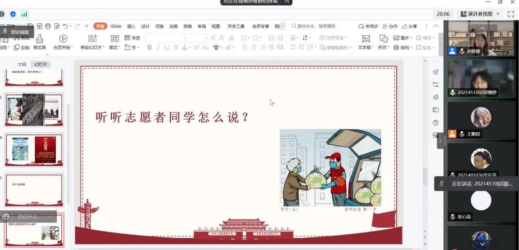 首先,孙雅静老师从长征讲起,介绍了我国发展道路上各代人的“长征路”,当时代的接力棒交到我们手中,我们既应是乘凉人,也要是种树人。进而引出本次会议的主题——伟大的抗疫精神,并对21级同学在面对志愿者招募时的积极反应表示赞许与肯定。