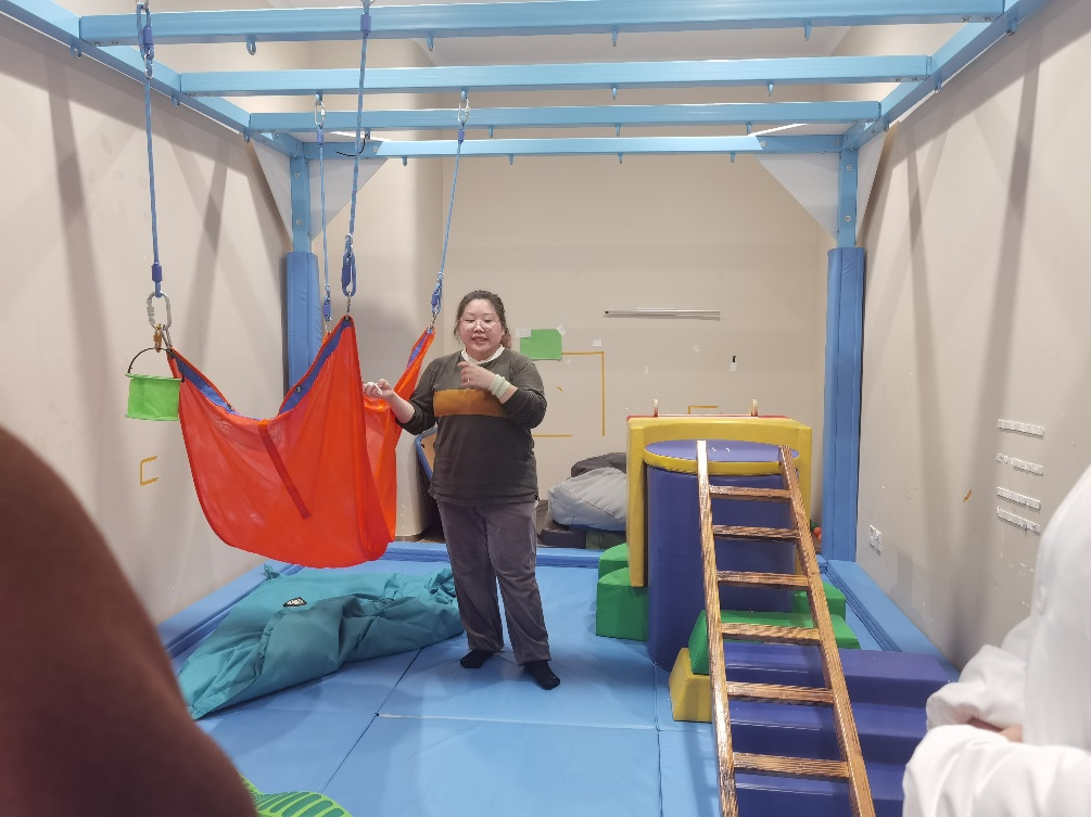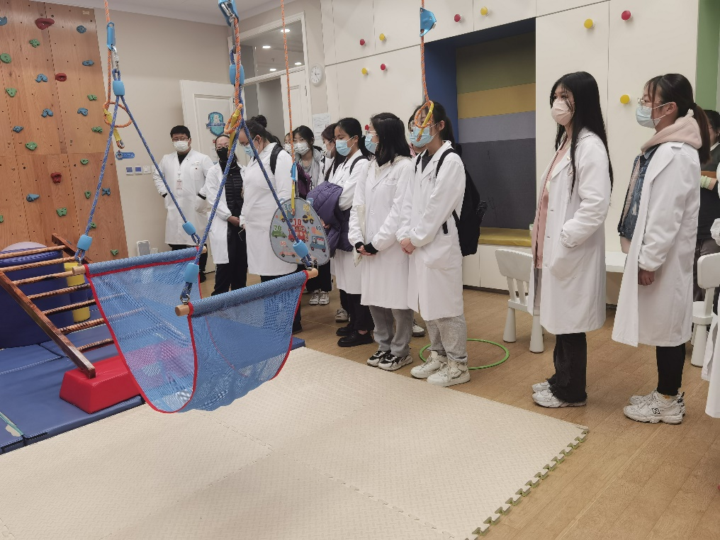尽管天空飘着绵绵细雨,也抵挡不住同学们的热情,大家满怀期待与好奇,身穿白大褂,全程佩戴口罩进行参观。走进作业治疗康复室,映入眼帘的是吊床、秋千、攀岩墙等娱乐设施,琳琅满目。为了给孩子们塑造了一个轻松愉悦的治疗氛围,治疗师们多身着便装,方便与患儿更亲近,使患儿更配合治疗。