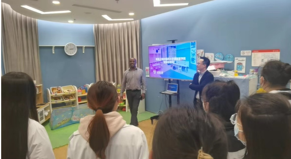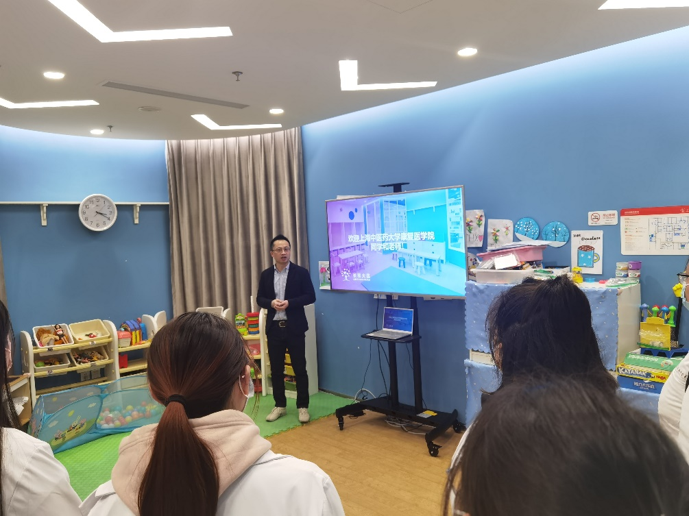 同学们在作业治疗治疗室偶遇作业治疗师章雪琳老师,她正在与患儿家属沟通并计划后续的康复治疗方案,过程非常和谐且高效。她也是上中医毕业的学子,随后,章老师耐心地为学弟学妹们讲述了一些工作中的治疗经验以及作业治疗的专业知识。紧接着,长和大蕴儿科门诊的白滔经理给同学们介绍了机构的整体情况,包括专家学者、团队构成、科室设置等内容,让大家对于机构有了初步概念。长和引入了国际领先康复临床技术和模式,与本地康复服务实践有机结合,进行全方位的儿童服务,机构的主要优势在于具有国际化、循证医学、跨学科合作的指导思想。之后,资深的总治疗师长Dennis老师使用双语为大家介绍他执业多年来在康复行业累积的经验,并强调了多学科合作的重要性。
