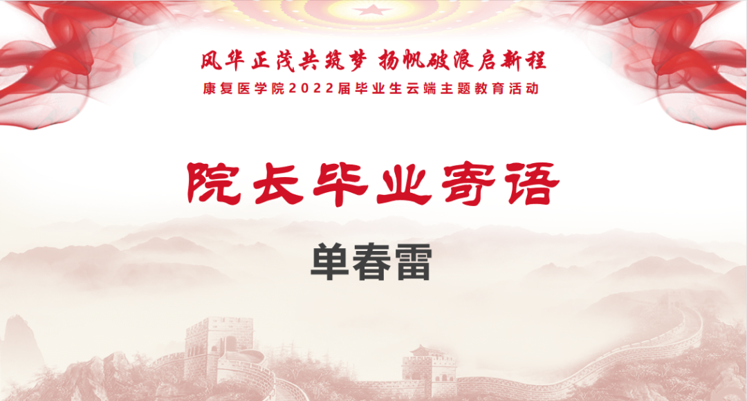 单春雷以《铭记医者仁心,勇担康复使命》为题向2022届全体毕业生寄语。他向学有所成的康复学子们表示祝贺,鼓励同学们牢固树立科学精神、熟练掌握科技知识、着力提升人文素养、耐心打磨沟通技巧,早日成长为康复医学的骨干、社会发展的栋梁、民族复兴的脊梁,用仁爱的心、温情的眼、智慧的手帮助病人和社会,用责任担当助力中华民族伟大复兴。