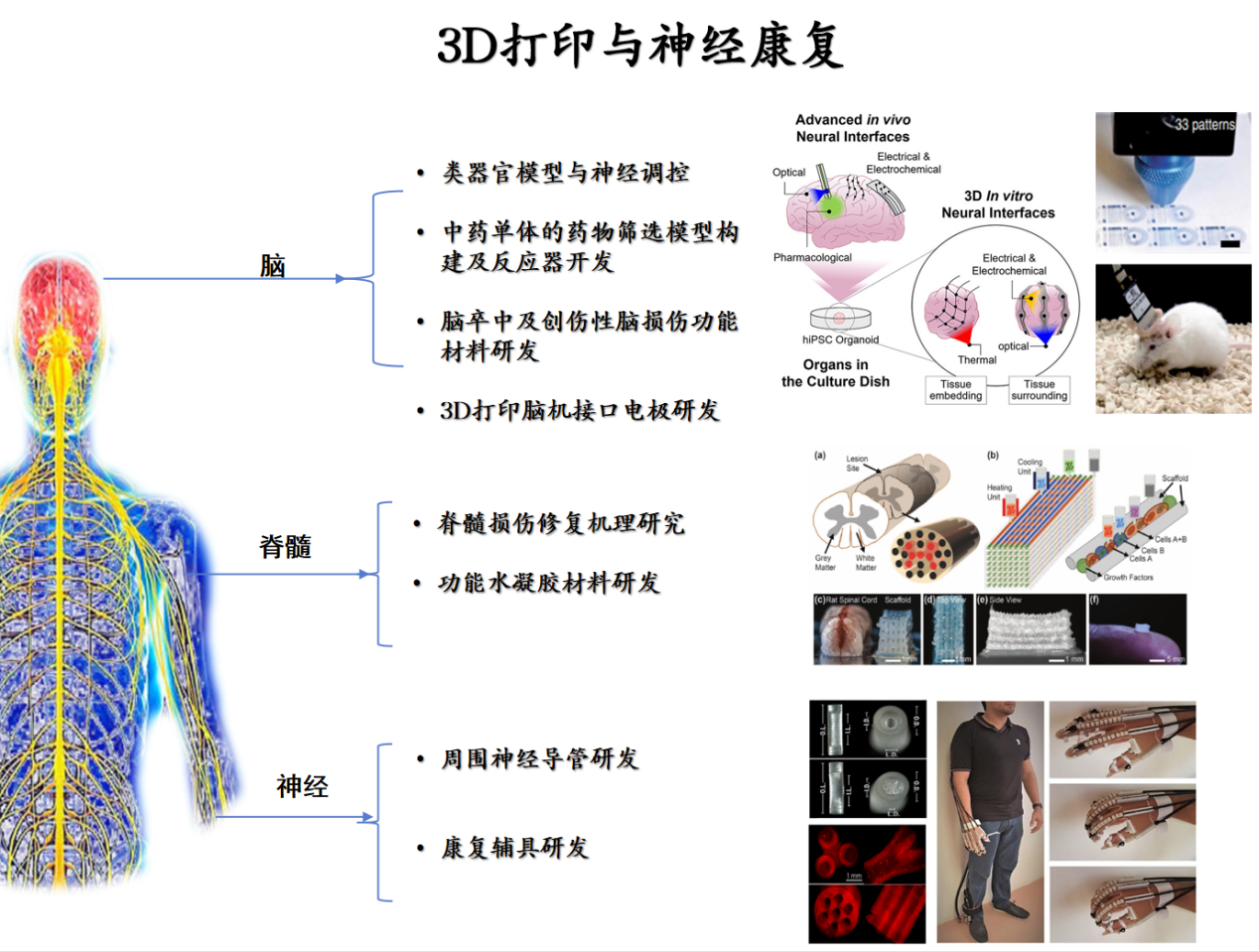 利用先进生物技术,进行脑与神经损伤的再生修复打印水凝胶研究开发3D植入式可降解神经支架并加载多功能干细胞、生物因子等应用于神经损伤修复。目前平台已自主创新制备出可光交联的3D打印水凝胶墨水,可应用于脊髓损伤修复,创伤脑损伤等在神经调控机理研究方面。