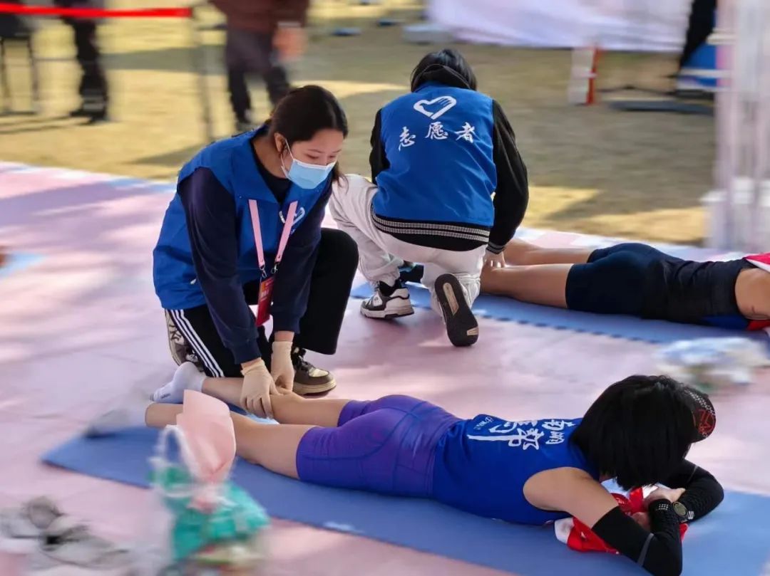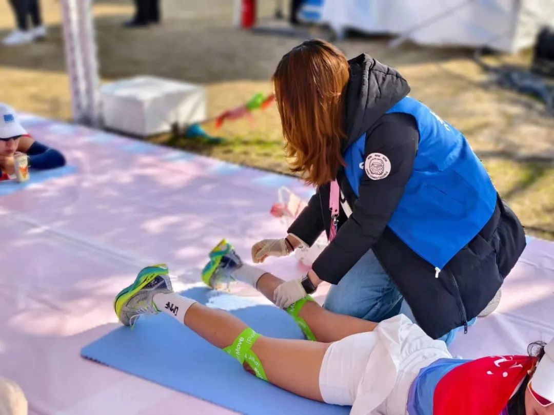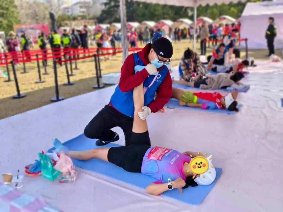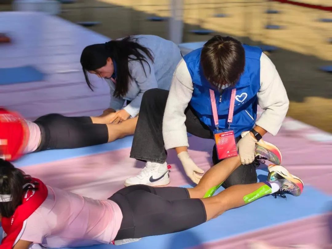 当选手们冲过终点,身体的疲惫和肌肉的紧张需要得到及时的缓解。这时,太阳成集团tyc122cc的同学们便成了她们最贴心的守护者。他们运用所学的康复治疗知识,为选手们进行科学的肌肉牵伸,帮助她们放松紧绷的肌肉,缓解疼痛,预防运动损伤。每一根手指的力度都恰到好处,每一个动作都充满关怀,他们的专业和细心赢得了选手们的广泛赞誉。