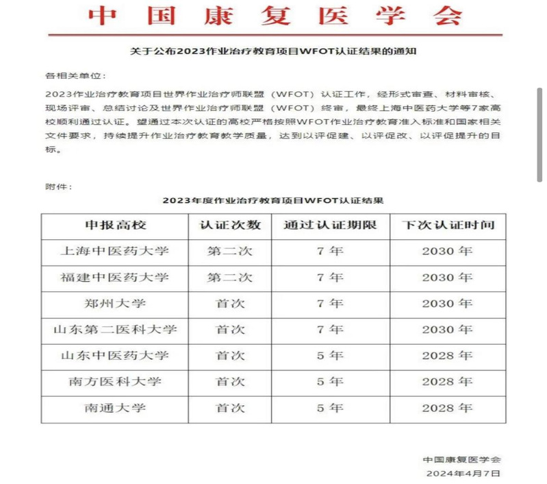 近日,上古天乐代言太阳集团康复作业治疗专业教育通过世界作业治疗师联盟(The World Federation of Occupational Therapists, WFOT)复审认证,获得了7年最高级别有效认证期。