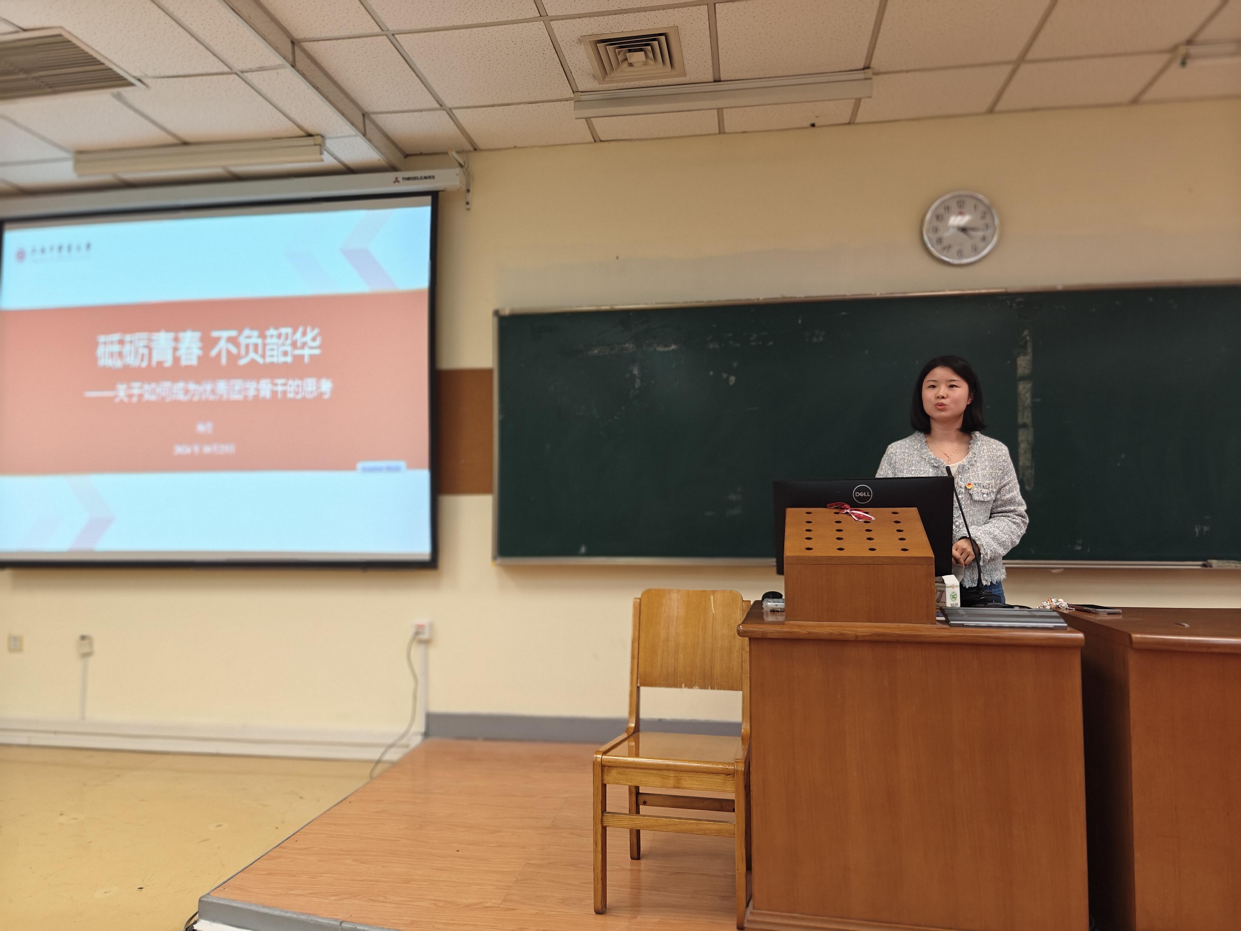 杨莹老师以砥砺青春,不负韶华为主题开展团课,通过与同学交流自身经历,引申出对于团学骨干的理解,提出优秀员工干部应该做到认真负责、公平公正、品学兼优、待人亲切,她提出,团干部应当富有理想、对党忠诚、提升本领、具备服务意识与砥砺品质、认真学习。