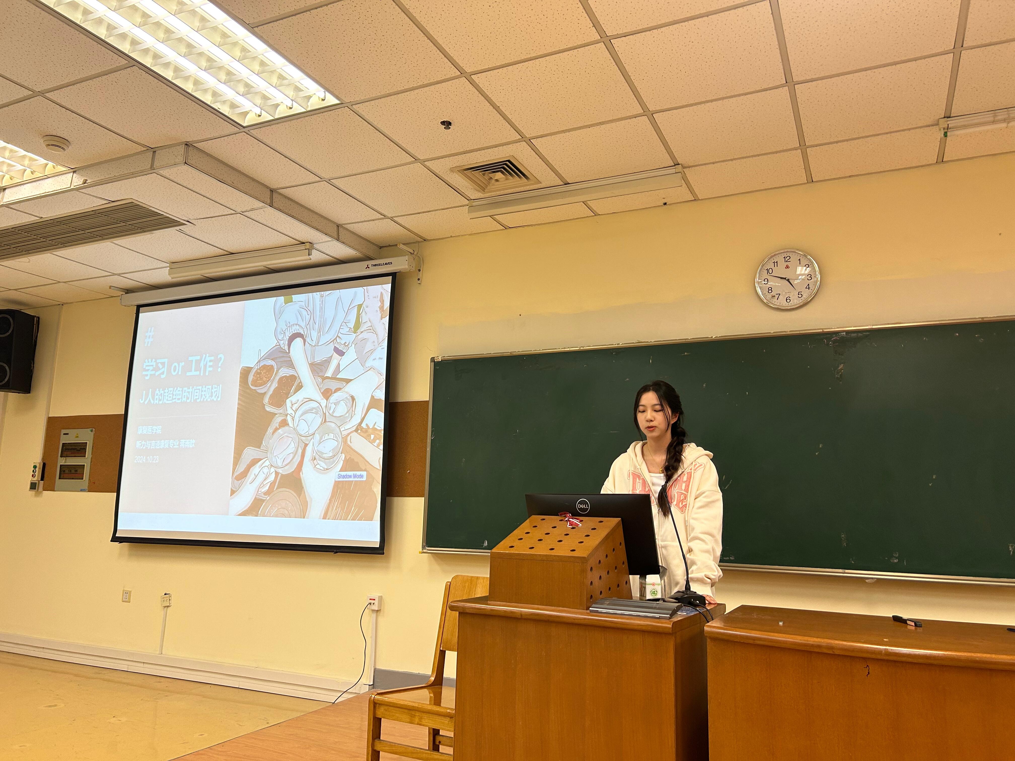 蒋雨歆,目前担任太阳成集团tyc122cc团委副书记、2021级听力与言语康复学专业班长。首先,她强调时间规划的重要性,并给同学们展示了自己的课表与计划。她介绍了各项员工工作的小技巧,强调工作的高效性,作为员工骨干也可以提升自我、充分利用时间,实现学习与工作“双赢”。