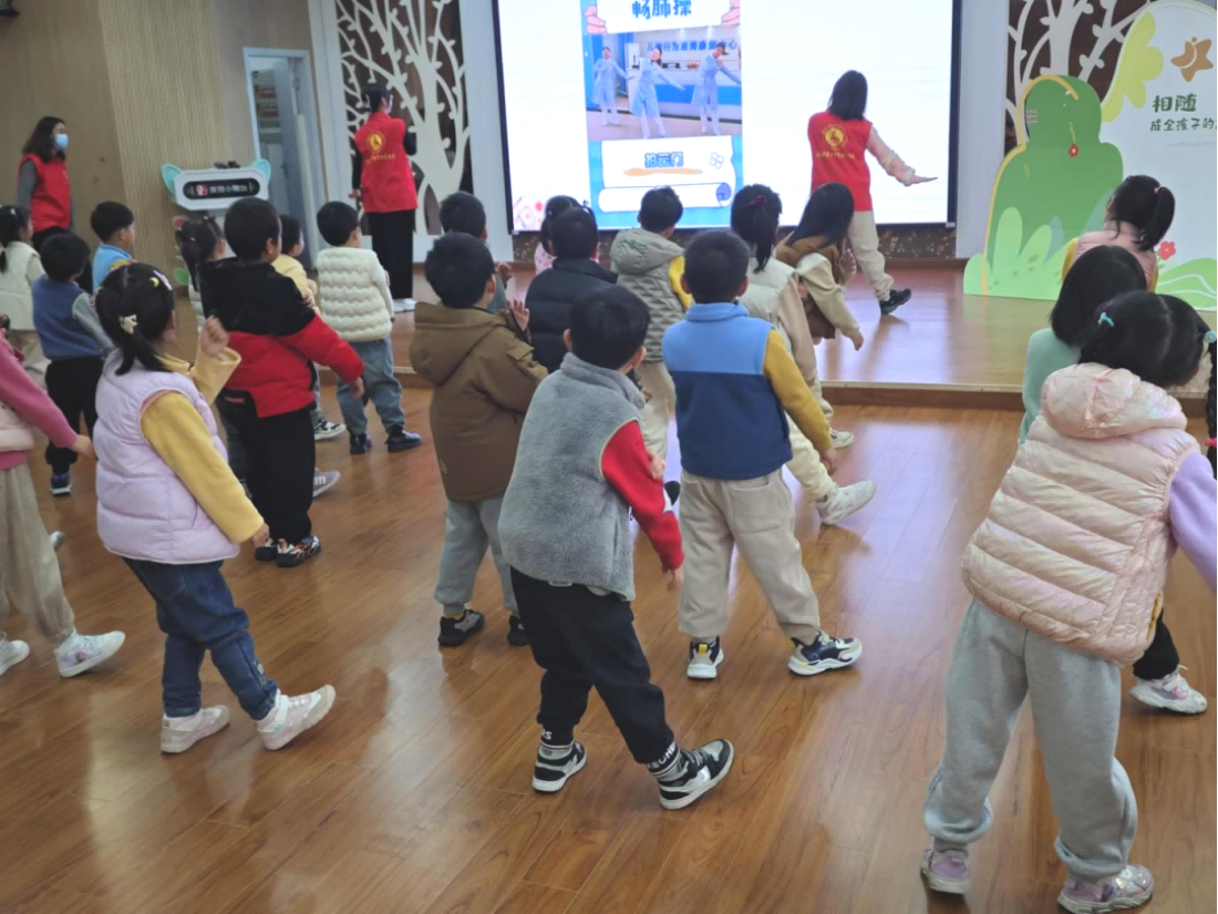 接着孩子们跟着志愿者学习了几套简单的冬季保健操。随着欢快的节奏,孩子们认真地模仿着志愿者的动作,抬手、弯腰、踢腿,一招一式都有模有样。