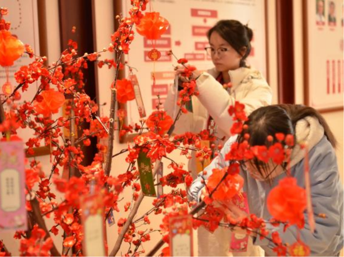 在红火的腊梅树旁,欢度新春的趣味灯谜环节成为了大家争相参与的热点。一条条精心设计的灯谜悬挂在灯笼之下,既有传统的字谜、成语谜,也有结合现代生活元素的创新谜语。同学们或低头沉思,或相互讨论,试图解开这些充满智慧的谜题。这一环节不仅考验了同学们的智力和反应能力,更增添了节日的欢乐氛围,让大家在开动脑筋中感受到了传统文化的魅力。