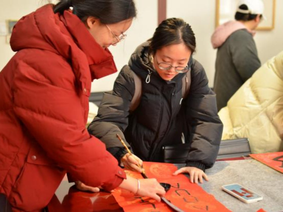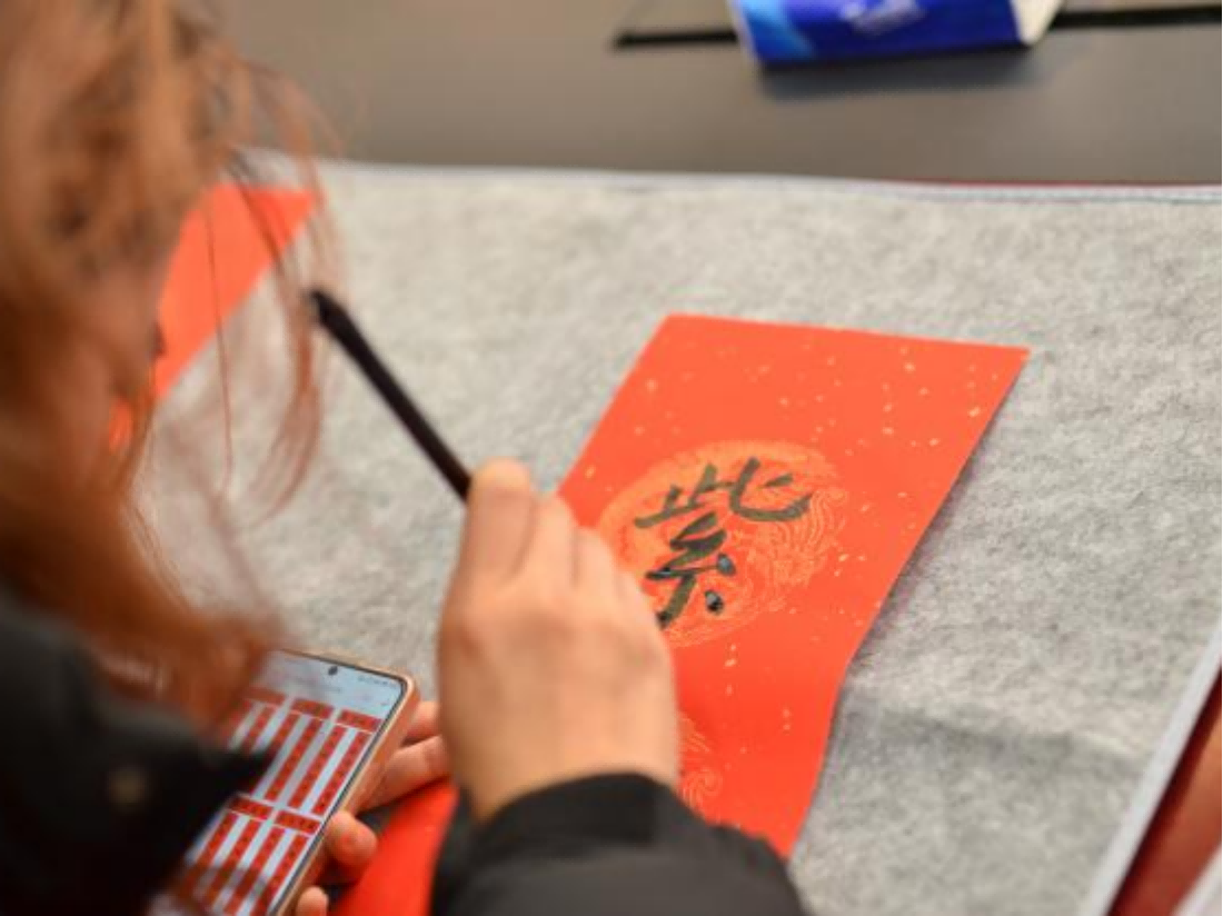 书法爱好者们在现场挥毫泼墨,展示了精湛的对联书写技艺。同学们热情高涨,满心欢喜地写下自己的祝福与期望,有结合蛇年绘画的可爱福字,也有别出心裁的“科研人”春联,同学们沉浸在中华优秀传统文化的美妙中,现场洋溢着淡淡的墨香和欢声笑语。