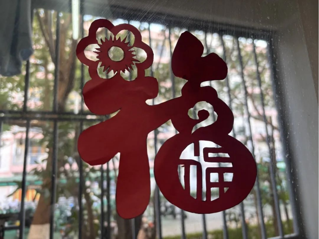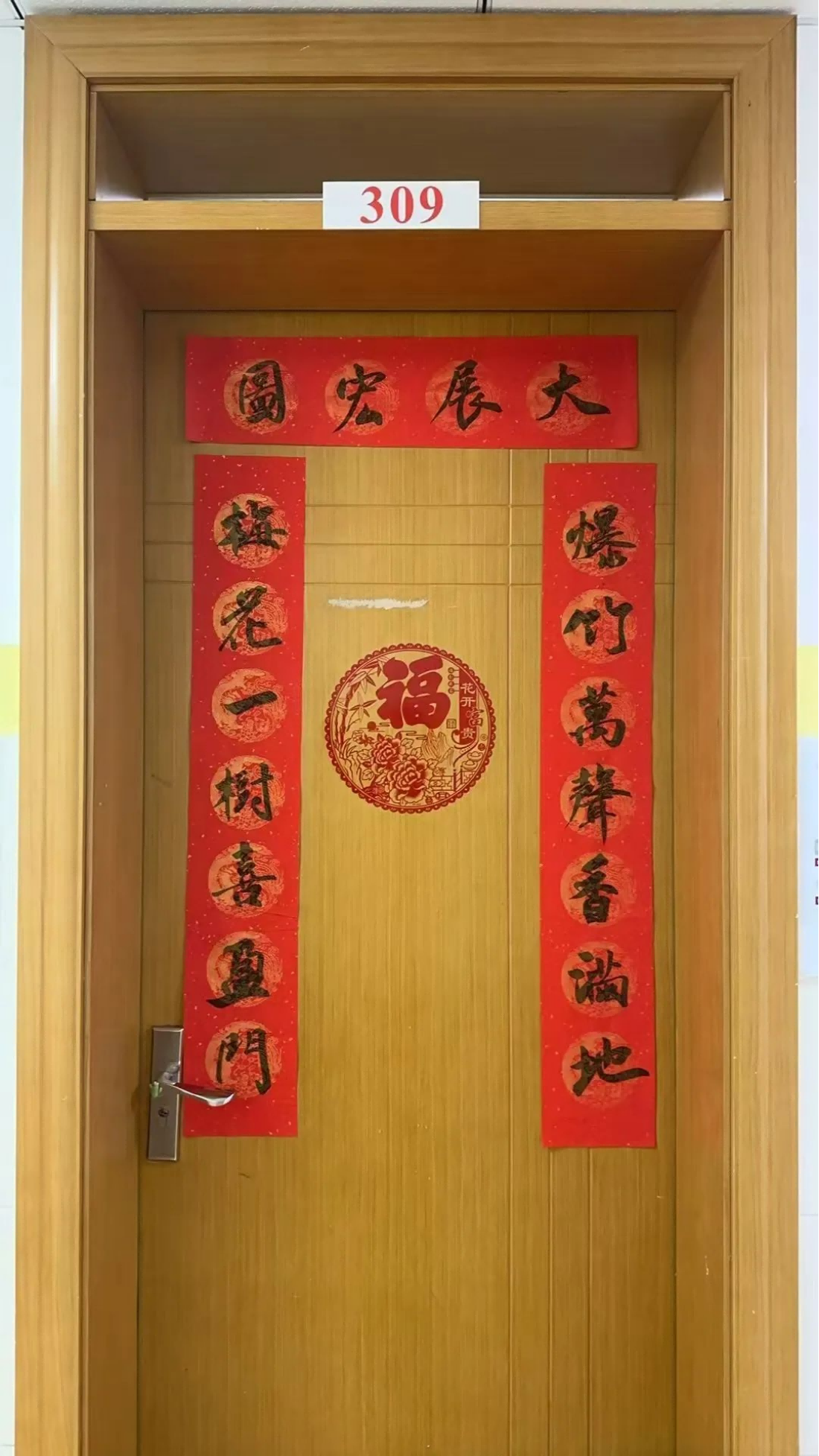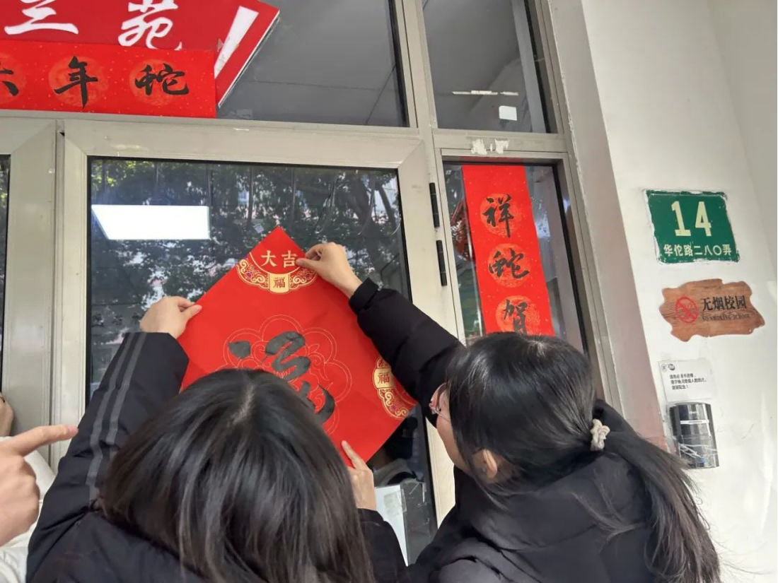 园区的同学们也为宿舍进行了精心装扮。大家贴上喜庆的春联和窗花,将宿舍装点得年味十足。整个园区因此被浓厚的新年氛围所笼罩,处处洋溢着欢乐与祥和的气息。