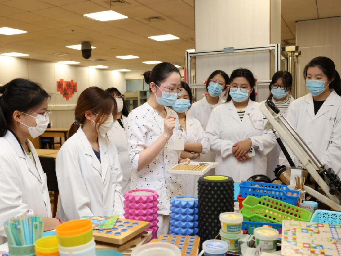 在作业治疗区,治疗师为同学们展示了智能康复训练设备,通过“打地鼠”、“抓蝴蝶”等趣味游戏提升他们的训练积极性,锻炼患者的上肢功能。参观中,同学们也体会了作业治疗师所要具备的创造力,通过设计贴近生活的治疗内容和巧妙的工具改造,让病人通过作业治疗能够再次完成他们想要做的事情,提高他们的日常生活活动能力,重新找回生活的自主感,开启新生。