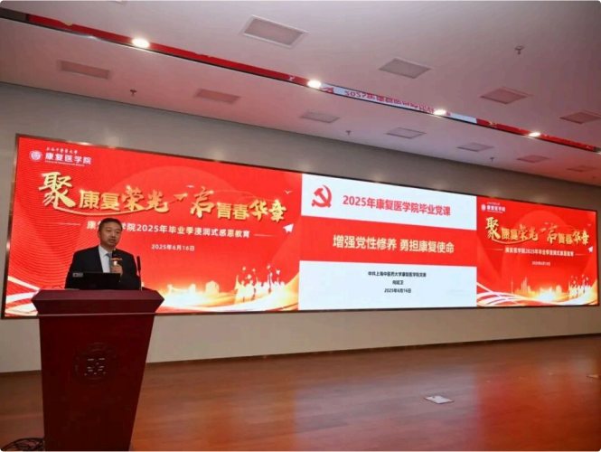 向延卫以   增强党性修养 ,勇担康复使命”  为主题讲授专题党课 ,引导毕业⽣们坚定理想信 ,永葆昂扬向上的奋⽃姿态 ,在求知探索中锤炼品德、开阔视野 ,始终铭记⺟校谆谆教诲  在追求康复医学进步的道路上勤于磨砺 ,精于积累 ,以满腔热忱和昂扬⽃志 ,砥砺前⾏ ,不负 韶华 ,为康复事业贡献⻘春⼒量 ,奋⼒谱写⼈⽣崭新篇章。