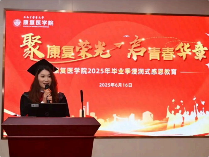 在毕业⽣代表发⾔环节 ,上海市优秀毕业⽣陆娟娟回顾了⾃⼰在校期间的成⻓历程 ,追忆同窗的珍贵情谊 ,感恩师⻓的悉⼼指导 ,感谢公司的培养与⽀持 ,展望未来 ,愿毕业⽣们⽆论未来⾝处何⽅皆能不负期望 ,始终秉持康复精神 ,以所学投⾝实践 ,回馈社会 ,践⾏初⼼使命  书写⽆悔⻘春。
