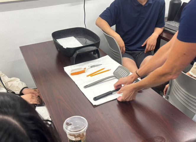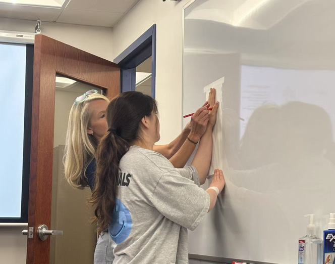 课堂的高潮当属动手实践环节。在教授的全程指导下,我们两人一组开始制作腕关节矫形器。从根据搭档手臂尺寸绘制精准草图,到将热塑材料放入沸水中加热软化,再到小心翼翼地裁剪塑形,让材料如 第二层皮肤” 般贴合腕部曲线,最后粘贴魔术贴、打磨边缘使其温润舒适……每一个步骤都充满探索的乐趣。当同学们纷纷举起自己亲手制作的矫形器,看着它完美适配搭档的肢体时,教室里洋溢着成就感与欢声笑语,专业知识在实践中悄然生根,化作对 OT 事业更深刻的理解与热爱。
