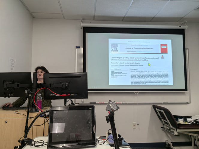 7/10Kathryn L. Garrett 教授为我们带来了一节生动、具有沉浸式体验的课堂,走入教室,同学们围坐在不同的桌子周围,桌子上摆放着不同写满字母的纸张,以及一些简易按钮和磁带。课程一开始教授介绍了AAC—辅助和替代沟通,是指为那些有言语或语言障碍的人提供的沟通方法和工具,帮助他们表达需求、想法和情感。为了更好的帮助我们理解AAC,教授设置了一个十分钟的小闹钟,在这十分钟里我们将短暂失去我们说话的能力,也包括了点头摇头的能力,教授一手拿着一张分别写着yesno的纸,并提出问题设法让我们作答,同学们有些转动整个身体的方向,有些通过挑眉毛眨眼间来表达自己的意思,体验到了辅助替代沟通的内涵。随后教授按照是否需要借助工具将ACC分为了两类:辅助类和非辅助类,其中教授重点介绍了辅助类ACC,也就是如何利用工具来代替辅助患者沟通,结合了不同视频案例视频来帮助我们了解。之后教授依次介绍了ACC适用的人群(自闭症患者、重症监护室、渐冻症等)。